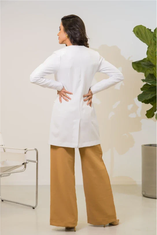 Com modelagem de alfaiataria impecável, ele foi pensado para mulheres que desejam transmitir autoridade com suavidade e estilo.